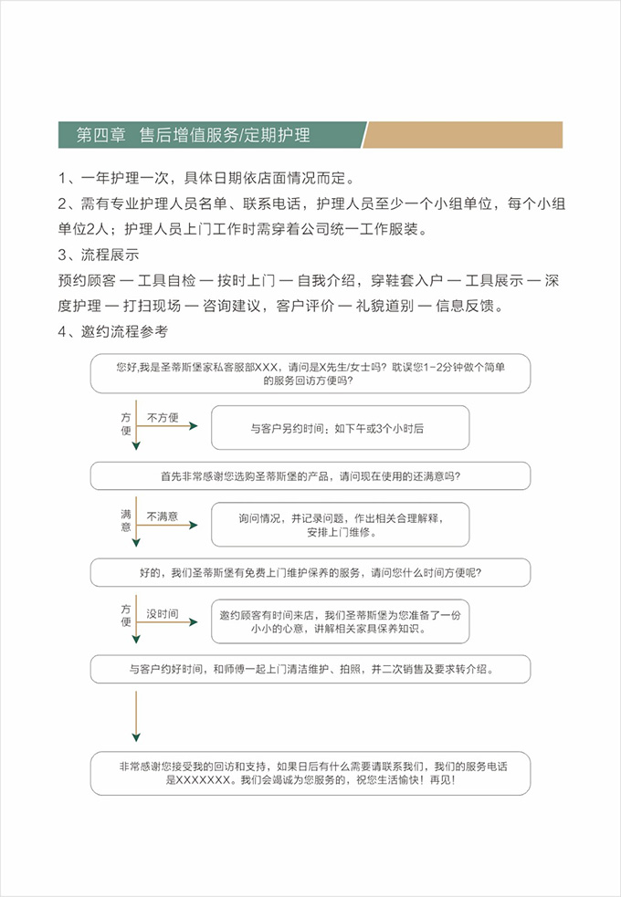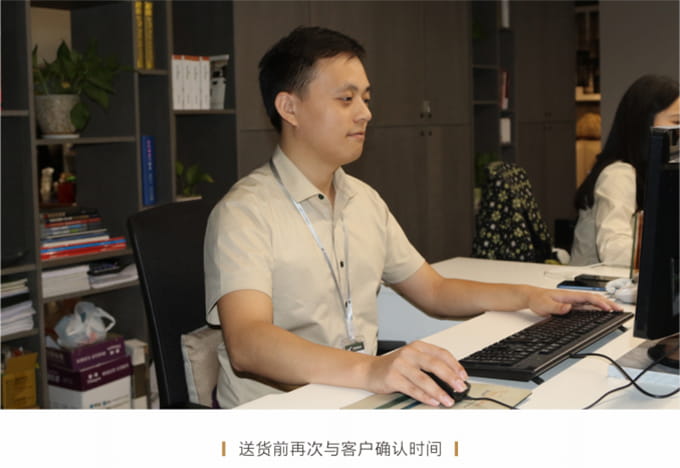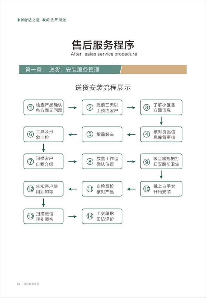 话术参考:“**先生/女士您好,我是AG闲庄·的售后服务人员**,您购买的AG闲庄·家具已经全部到货了,送货安装大约需要**时间,请问您这边什么时候方便我们上门送货安装呢?”同时要了解送货小区的电梯、楼道、入户门的尺寸等,提前做好准备,避免意外情况。最后确定送货时间(安装所需要时长),并告知客户安装人员的相关信息,可加微信发送,并发送配送安装流程说明。