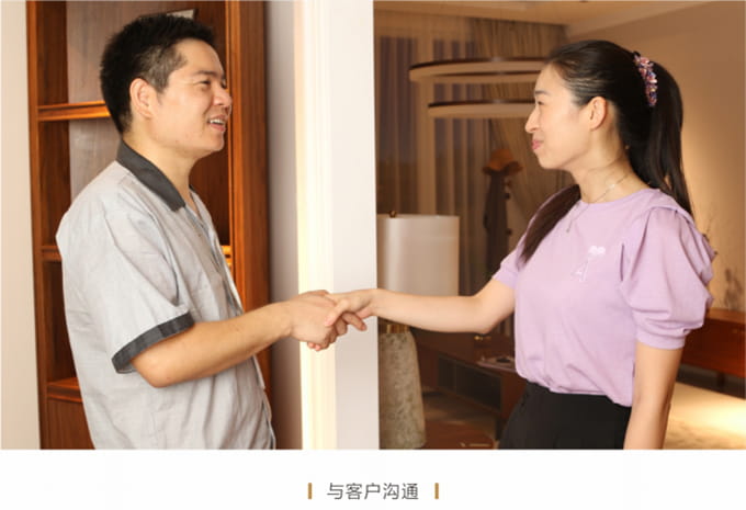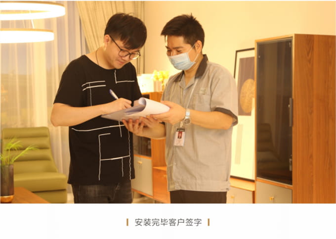 安装并检查完所有工作后,需与客户清点并确认产品,将所有带电源的家具插上电源,告知客户家具使用方法和功能及保养知识、注意事项等。所有带功能的产品需演示给客户看。例: